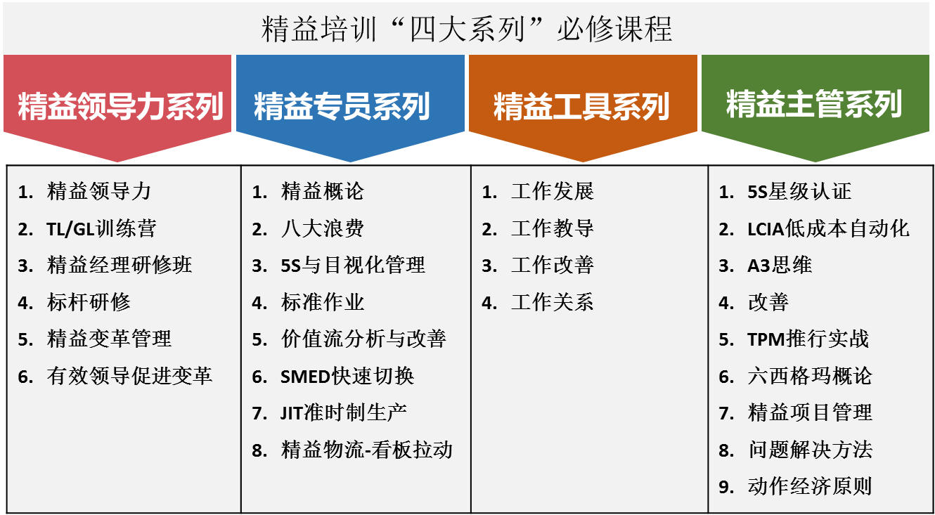 戴明精益管理培訓“四大系列”必修課程是企業推動(dòng)精益轉型過程中必修的精益理念、工具、系統和變(biàn)革能力,戴明咨詢爲企業提供行業的精益實戰必修課程企業内部選擇和開發課程節約時間,並(bìng)確(què)保企業獲得高質量的精益培訓資料,爲企業快速培養精益人才,搭建精益人才梯隊。