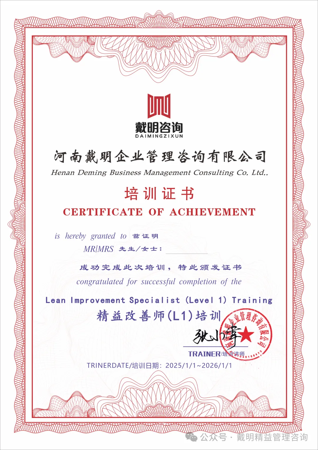 精益改善師(shī)(L1)培訓證書(shū)