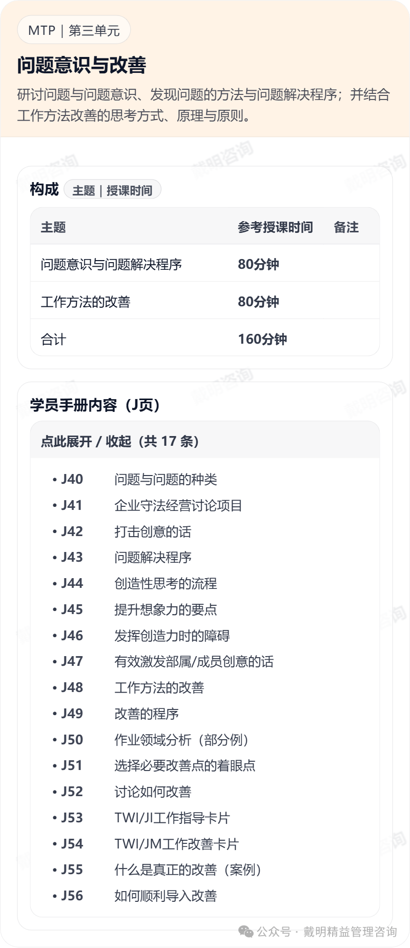 MTP(Management Training Program管理研修教程)源於(yú)二戰結束時美國爲日本開發的實戰性管理培訓課程,後來日本政府委托日本産業訓練協會在民間普及,1960-70年代中,有近90%的日本上市企業管理者接受過MTP培訓,54年來累積參(cān)加培訓人數超過150萬人。 MTP訓練中每項内容都是針對最精華的實戰性管理技能來進行,省去很多不必要的理論。因爲企業管理人員要掌握的是以“How to do it”爲主,而不是一堆不知如何運用的理論。因此MTP培訓絕非泛泛而談,而是讓學員“一針見血”的快速掌握實戰重點,這些都是MTP的設計精神。