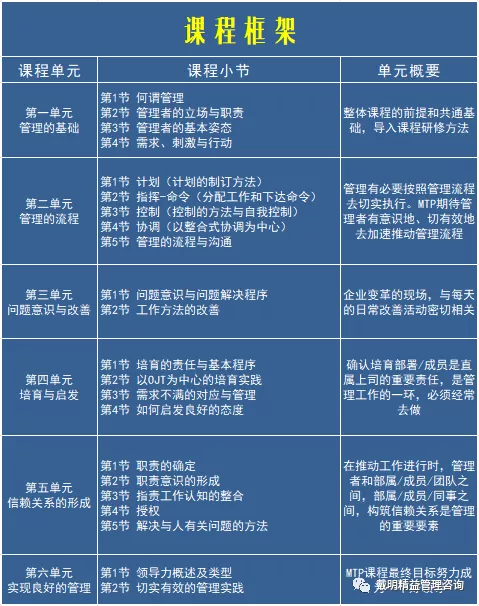 [3] 學習目标:使學習者能夠将整個管理體的方法通過梳理,並(bìng)掌握能講授與管理相關的知識、技能、态度的培訓能力,内外兼修地把握管理者的立場(chǎng)與職責,将各種管理工具融會(huì)貫(guàn)通地運用自如。
